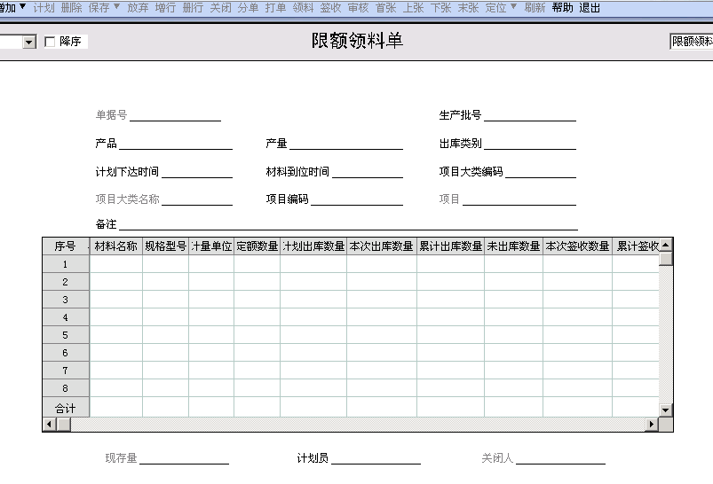 九、限额领料单