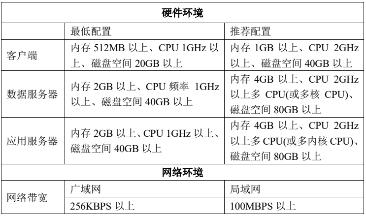 注:T6 系列产品支持的最大客户端数为 100 个。数据服务器和应用服务器的配置应随最大并发数(站点数)的增加而调整,当并发数小于 20 个站点时,可使用标准配置,如果并发数超过 20 个站点,可通过增大内存和 CPU 来提高访问性能,同时剩余硬盘空间将随着用户数据增多而合理的扩展。客户端配置和并发数无关。