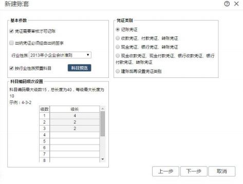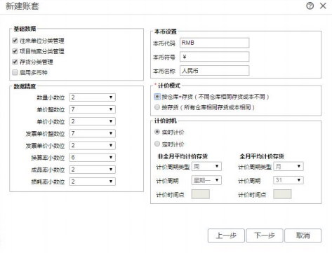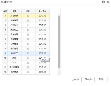 输入会计期间后,点击〖下一步〗,进入功能启用。用户可根据企业的需求对相应功能进行启用,建账后也可重新选择。功能启用见下图: