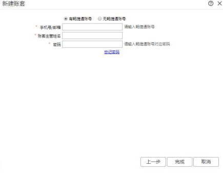 选择业务流程之后,点击〖下一步〗,进入账套主管设置,输入账套主管账号、姓名、密码。如开通云应用,无畅捷通账号,可选择先创建账号再完成建账。