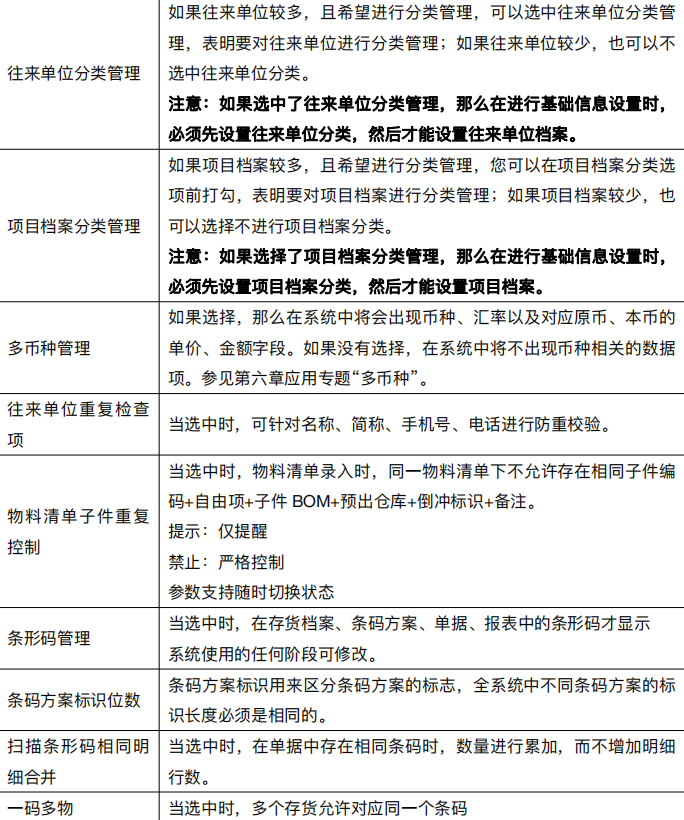 系统选项也称系统参数、业务处理控制参数,是指在企业业务处理过程中所使用的各种控制参数,系统参数的设置将决定用户使用系统的业务流程、业务模式、数据流向。用户在进行选项设置之前,一定要详细了解选项开关对业务处理流程的影响,并结合企业的实际业务需要进行设置。由于有些选项在日常业务开始后不能随意更改,用户最好在业务开始前进行全盘考虑,尤其对产品全局有影响的选项设置更要考虑清楚。