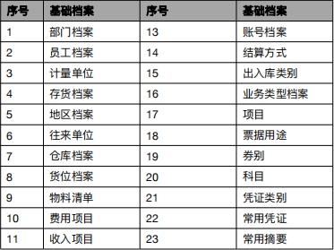 在开始日常业务之前,必须设置所用到的基础数据,以下是设置主要的基础档案顺序: