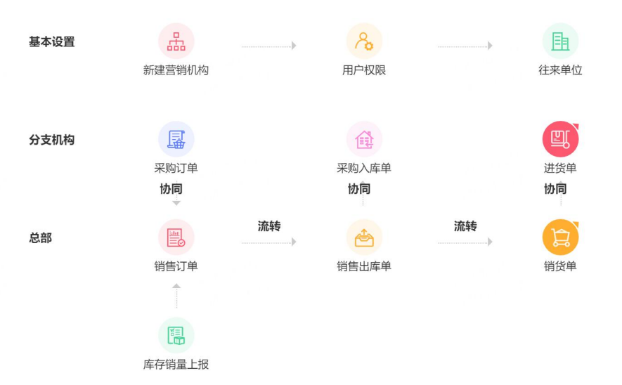 企业给经销商建立一个营销机构档案(系统自动建立对应的登陆账号、对应客户以及供应商等信息),经销商填制采购订单,然后通过采购订单协同生成总部的销售订单。总部审核销售订单,并确定发货(销货)后,再协同生成经销商的收货(进货)单。选中“多营销机构”选项时,经销商可以处理自己的批发业务;选中“加店管理”时,也可以建立门店,处理零售收银,以及引用总部会员和建立自己的零售促销方案。总部可以汇总查询经销商的库存量及销量分布,经销商也可以查询自己的库存量、往来账等。