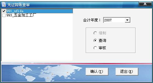 选择账套后,系统自动增加选择账套的已存年度,选择处理方式后进行操作,系统暂时封存跨账制单功能;【确认】:进行凭证跨账套查询或审核,系统调用 T6 的产品功能;