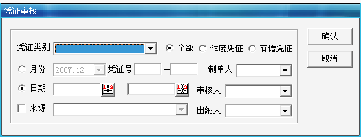 凭证审核调用界面;系统在【确认】时进行合法性校验,如果未进行账套选择,系统给出提示;
