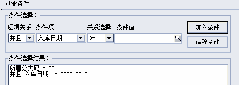 2、条件项:入库日期;关系选择:>=;条件值:2003-08-01;逻辑关系:并且。这样,确认时的参照条件的含义为:查看存货分类为 00、且入库日期在2003-08-01 以上的单据记录。关系选择使用 like 时,条件值可以使用模糊匹配值,*代表任何字符,?代表一个字符。如存货编号像 A01*,表示查询所有以 A01 打头的存货编号的记录。
