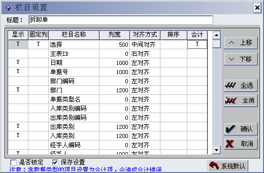 2、 将光标移至要在界面显示的项目上,用鼠标双击该项目右侧的显示项栏目,将该栏目置为打勾状态。并用鼠标单击〖上移〗按钮或〖下移〗按钮,调整此项目在单据列表中的显示位置。