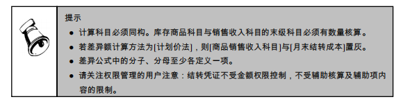 ● 计算科目:由用户指定库存商品科目、商品销售收入科目、商品销售成本科目、进销差价科目四个科目。用户可输入总账科目或明细科目,但输入要求这三个科目具有相同结构的明细科目,即要求库存商品科目和商品销售收入科目下的所有明细科目必须都有数量核算,且这三个科目的下级必须一一对应。结转方式:提供两种转账生成分录的方式:月末结转成本方式/月末调整成本方式。
