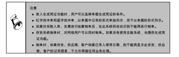 购销存单据生成凭证:用于对本会计月已记账单据生成凭证,并可对已生成的所有凭证进行查询显示;所生成的凭证可在账务系统中显示及生成科目总账。供应商往来单据生成凭证:用户可对各种供应商往来业务处理进行批量制单;客户往来单据生成凭证:用户可对各种客户往来业务处理进行批量制单。以购销存单据生成凭证为例