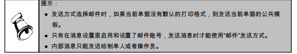 用户可以在单据界面选择当前单据相关的接收人、将单据信息作为附件发送给邮件接收人,包括客户(供应商)、部门负责人、业务员或者其他需要通知的人员,也可以编辑内部消息,发送给内部人员。单据发送消息的方式:内部消息和邮件。支持单据:采购订单、采购入库单、采购发票、其他应付单、销售订单、发货单、销售发票、其他应收单、销售出库单、产成品入库单、生产加工单、材料出库单、付款结算单、收款结算单等核心单据。