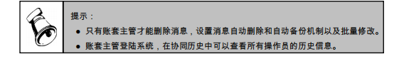 自动删除:设置保留操作员前 X 天发送的消息,即如果操作员设置是 10,当前服务器时间是 2011-12-08,系统只保留[2011-12-08]-10,也就是发送日期和接收日期小于2011-11-28 的消息都将删除;