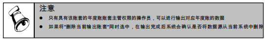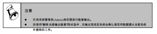 输出账套功能是指将所选的账套数据进行备份输出。对于企业系统管理员来讲,定时的将企业数据备份出来存储到不同的介质上(如常见的光盘、网络磁盘等等),对数据的安全性是非常重要的。如果企业由于不可预知的原因(如地震、火灾、计算机病毒、人为的误操作等等),需要对数据进行进行恢复,此时备份数据就可以将企业的损失降到最小。当然,对于异地管理的公司,此种方法还可以解决审计和数据汇总的问题。各个企业应根据各企业实际情况加以应用。