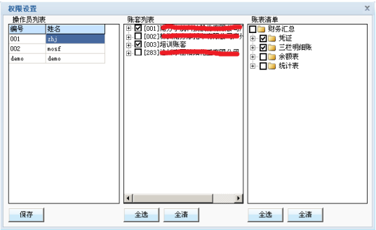 操作说明:从左到右依次进行设置,设置完毕后点击保存则完成了该操作员的权限设置,注意:每配置完一个操作员都要保存一下,否则无效。这里需要说明的是如果要删除某个操作员的权限,只需要将相应列表下的权限去掉,再保存即可。如要删除操作员 001 的账表权限,只允许该操作员查看[001]账套,则只要将[003]账套前面的勾去掉,再点击保存即可。若要删除所有权限,也是如此,在弹出相应提示时选择“是”则删除了该操作员相应的权限。只要当 3 列都要选择项时,权限设置才算成功。