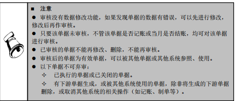 在实际业务过程中,审核常常是对当前业务完成的确认。有些单据只有经过审核,才是有效单据,才能进入下一流程,被其他单据参照或被其他功能、其他系统使用。单据审核后,可以弃审。有下游单据生成,或被其他功能、其他系统使用,视为单据已经执行,已执行的单据不可弃审。单据只能整张审核/弃审,不可拆单。