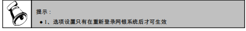 系统在建立新的账套后由于具体情况各不相同或业务的变更,对各功能的要求也有所不同,因此需要根据具体情况对网银系统进行定制,以适应企业的管理方式。“选项“功能提供了与网银系统有关的参数设置,这些参数决定了网银的各项执行功能及控制方式。