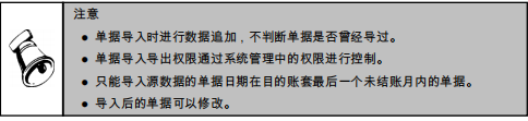 ● 导入时校验单据必输项。导入单据后的单据状态与新增一张单据相同,为可编辑状态,制单人为源数据的制单人,如果目的账套无此操作员,则不进行导入。