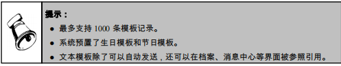 本功能主要用于自动发送文本信息的模板设置,包括文本、生日和节日模板,例如通过设置自动模板,可以向客户、供应商以及员工等自动发送生日和节日祝福;文本模板也可以在档案、消息中心等界面被参照引用。