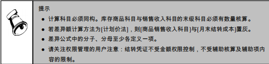 ● 计算科目:由用户指定库存商品科目、商品销售收入科目、商品销售成本科目、进销差价科目四个科目。用户可输入总账科目或明细科目,但输入要求这三个科目具有相同结构的明细科目,即要求库存商品科目和商品销售收入科目下的所有明细科目必须都有数量核算,且这三个科目的下级必须一一对应。结转方式:提供两种转账生成分录的方式:月末结转成本方式/月末调整成本方式。