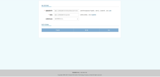 输入购买产品的畅捷通帐号和密码,验证正确后,在已购买企业里显示出购买产品的订单企业信息。如果找不到正确的企业请检查输入的账号是否是购买鉴权的账号。找到已购买企业后,在购买产品信息列表中可查看已购买的模块、用户、账套信息。点击界面上的【确认】按钮,将产品鉴权与当前使用系统进行绑定,正式授权。正式授权产品登录界面会展示出授权的企业信息。