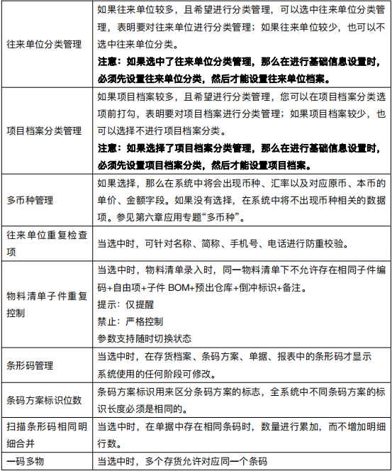 系统选项也称系统参数、业务处理控制参数,是指在企业业务处理过程中所使用的各种控制参数,系统参数的设置将决定用户使用系统的业务流程、业务模式、数据流向。用户在进行选项设置之前,一定要详细了解选项开关对业务处理流程的影响,并结合企业的实际业务需要进行设置。由于有些选项在日常业务开始后不能随意更改,用户最好在业务开始前进行全盘考虑,尤其对产品全局有影响的选项设置更要考虑清楚。