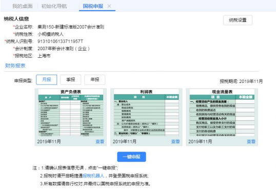一键申报应用基于 2019 新 TUFO,智能准确出具国税财报纳税申报表。