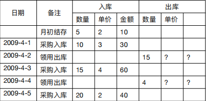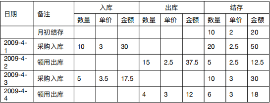 4 月 3 日入库 5 个之后,系统立即计算最新平均单位成本,(12.5+17.5)/(5+5)=3