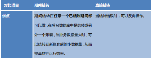 直接结转分为直接结账过渡到次年和新建会计期间过渡到次年,在数据库后台中是同一个数据库,期间结转需要进行期间结转的操作,在数据库后台中期间结转后会生成另外一个新的数据库。直接结转和期间结转具体的区别如下表所示: