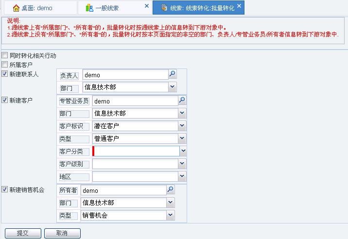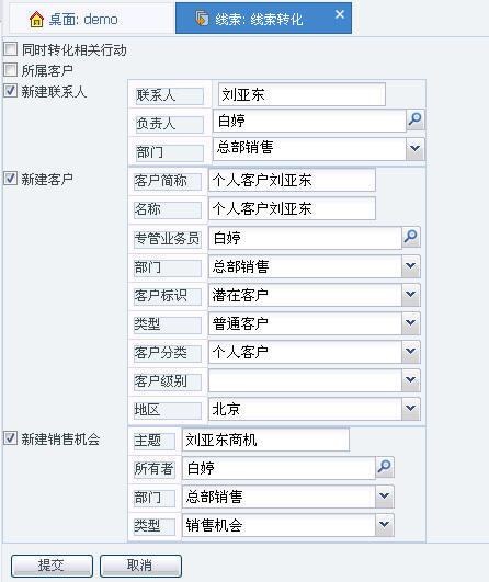 同时转化相关行动:选中此项后,转化联系人、客户、销售机会都能把源线索的相关行动带入到目标对象的相关行动中。