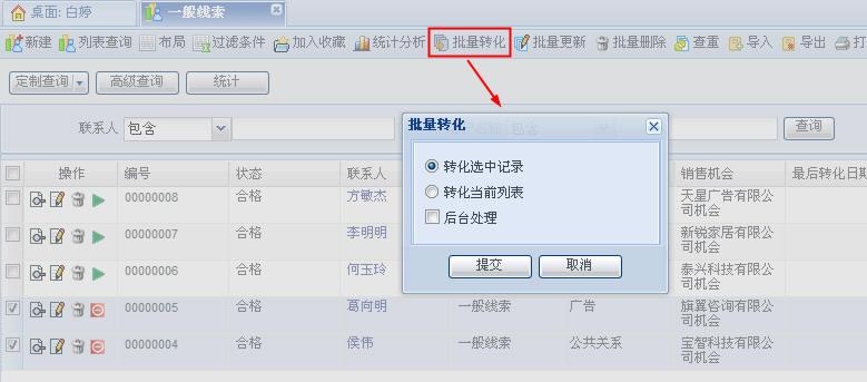 在线索的列表页面,选中需要转化的线索记录点击[批量转化]按钮,系统弹出批量转化操作窗口,(如果不选择记录点批量转化则默认是“转化当前列表”),确认是否是批转选中记录,如果是则直接点击提交。