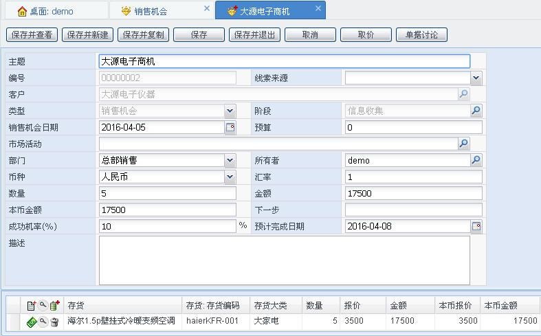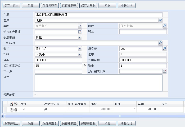 [保存并查看]:保存当前销售机会信息,并打开此销售机会的查看页面。