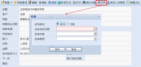 在窗口中选择销售机会成功标志:成功或失败。标志为成功时,需输入任务完成日期,点击保存按钮,即可关闭该销售机会;标志为失败时,需输入任务完成日期和丢单原因(丢单对象为选输项),点击保存按钮,即可关闭该销售机会。