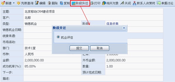 在销售机会详细信息查看页面点击[阶段升迁]按钮打开销售机会的阶段升迁确认窗口。