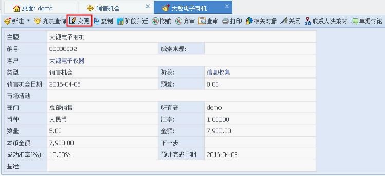 在销售机会的查看页面,点击“变更”按钮,进入销售机会的变更编辑页面。
