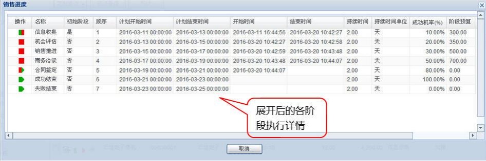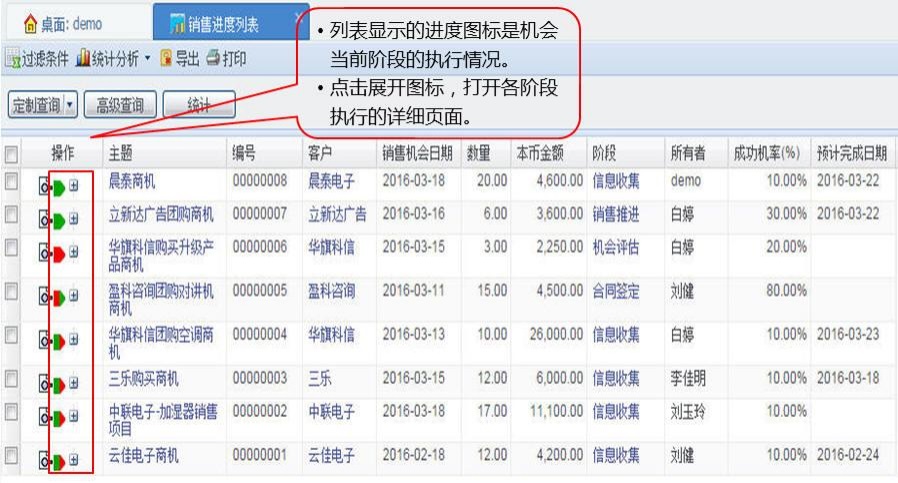 销售进度列表以销售机会展现为基础,列表显示的进度图标是机会当前阶段的执行情况。