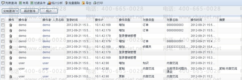 为了方便管理系统,CRM 提供相关日志的查询,包括系统日志、短信日志等。以系统日志为例,点击菜单“资源中心””“系统信息”“系统日志”,打开系统日志列表页面。