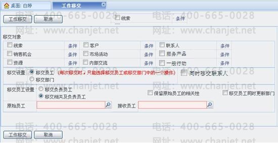 移交对象:“移交员工”和“移交部门”都可选择移交对象,或是对所选移交对象通过“条件”过滤数据来做移交。