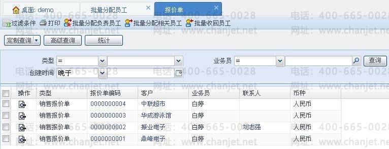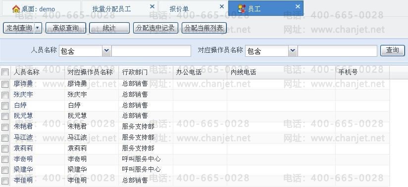 选择要分配(回收)的员工,点击分配选中记录或分配当前列表即可(回收时点击收回选中记录或收回当前列表)。