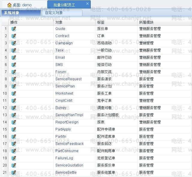 本列表展示除线索、客户、联系人、销售机会对象外可分配员工的对象(包含系统对象、自定义对象)。