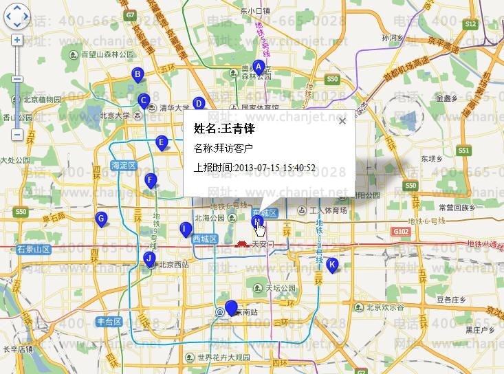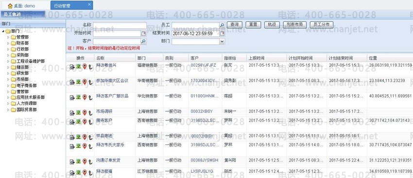 业务员行动管理是企业营销管理中的一个难点,移动管理行动管理功能给企业管理人员提供了实时有效的管理方法。业务员在移动端对行动所做的相关定位、拍照通过定位数据、照片文件上传到 CRM 服务器端,CRM 服务器端把这些和移动端相关的行动信息与上传的定位数据、照片文件进行集成,企业管理人员能在服务器端查询业务员的行动信息和上传的图片、定位信息,并可以定位行动轨迹。