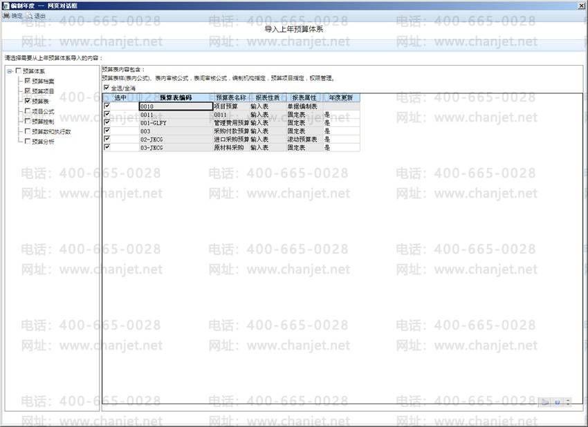 1、点击〖导入上年体系〗按钮,会弹出窗口,选择需要导入的内容,其中预算表和分析表允许选择部分表导入,如图 4-1-3。