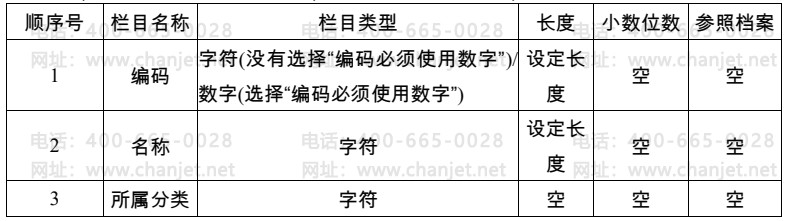  只有设置完成档案属性,才能进行栏目的设置。在设置完成档案属性后切换到栏目设置时,系统自动添加两行设置内容,如果是非分类档案且设置了所属分类,则再添加一行设置内容, 且顺序号不能调整,具体规则见下表: