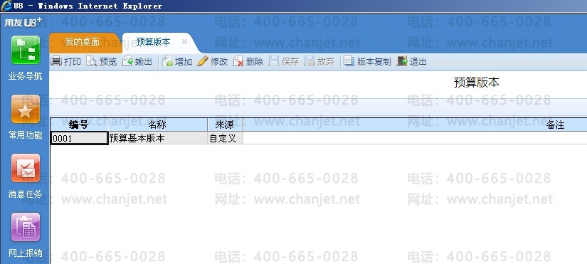 增加:单击〖增加〗按钮,将新增一行,输入预算版本编号、名称以及备注,确认输入点击〖保存〗按钮。
