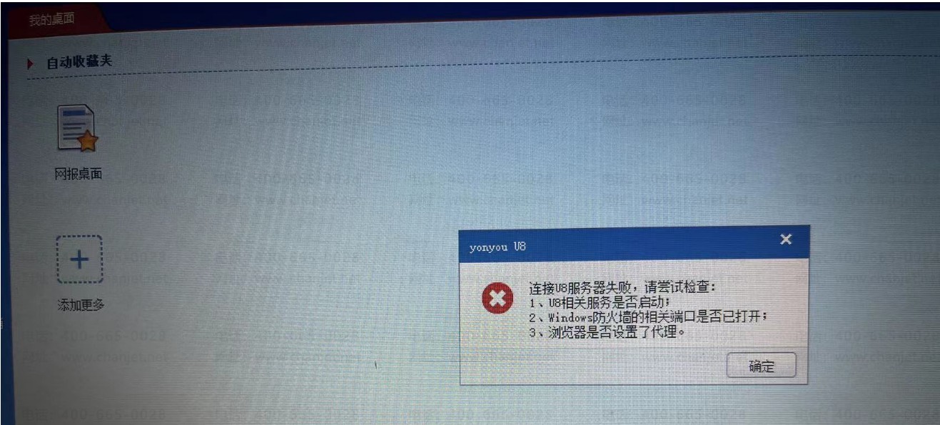 登录用友U8 Web客户端时提示“连接U8服务器失败,请尝试检查 ;U8相关服务是否启动;Windows防火墙的相关端口是否已打开;浏览器是否设置了代理;”