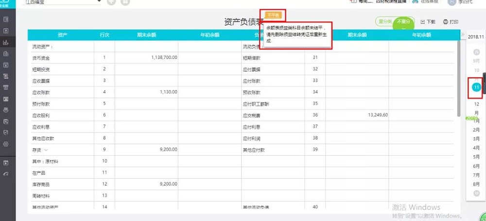 在做完结转损益的凭证,查看资产负债表是平衡的,但是之后又修改了涉及到损益类的凭证,此时客户进入【报表】-【资产负债表】界面,然后把鼠标放在【不平衡】3个字,系统会提示“余额表损益类科目余额未结平,请先删除损益结转凭证后重新生成”。报表情况如下图所示: