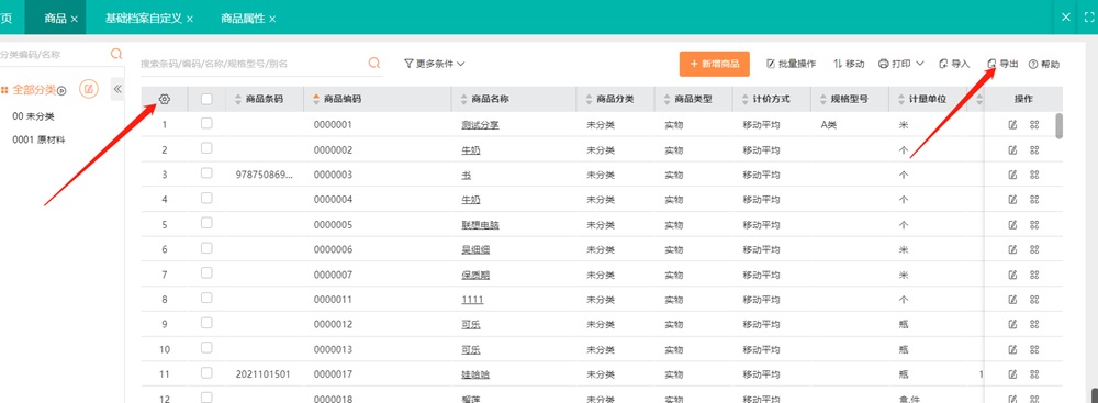 企业需要将商品导出,然后对实物进行盘点,或者导出查看相关商品,可以点击商品名称标题,点击齿轮,将需要的字段勾选显示,在点击右上角的导出,目前系统不支持商品分类单独导出,建议将商品分类勾选显示,在导出