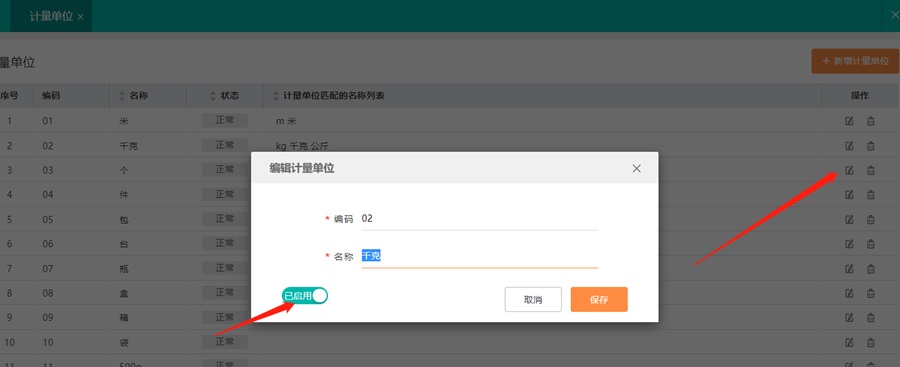 删除计量单位:计量单位已经被使用,不能删除,但是可以停用