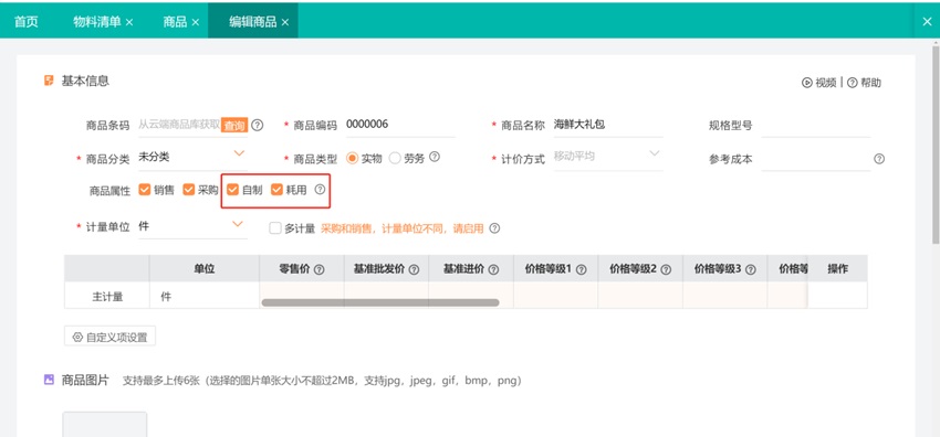 父件和子件所对应的商品属性:父件必须为自制属性,子件必须为耗用属性,半成品必须同时拥有自制属性和耗用属性