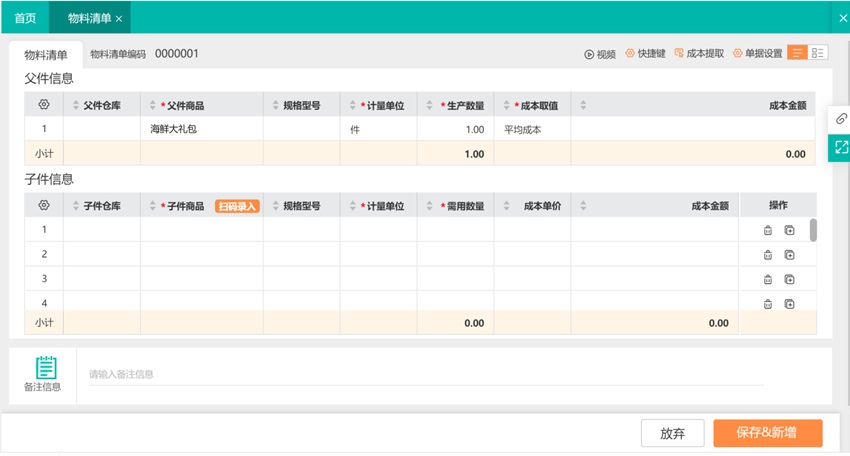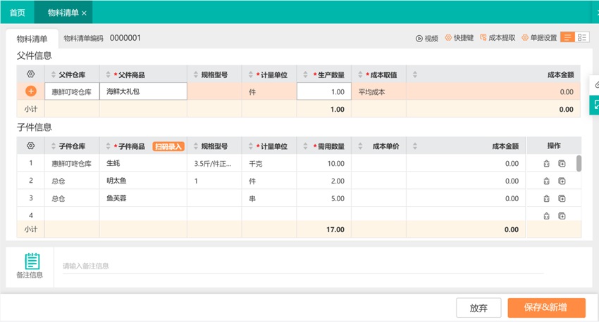 录入组成成品或半成品,所需要耗用的原材料和所需数量及材料出库仓库