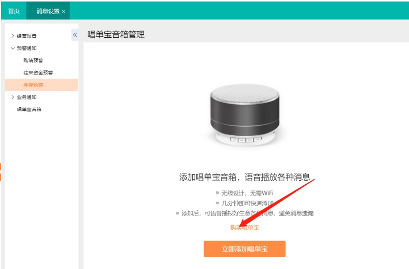 添加唱单宝音箱,语音播放各种消息,添加后,可语音播报好生意各种消息,避免消息遗漏