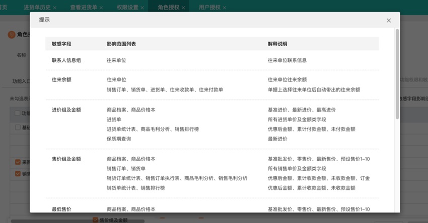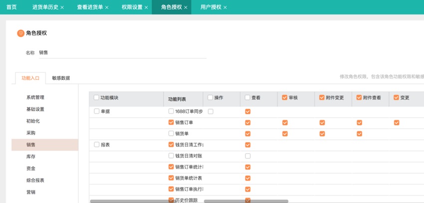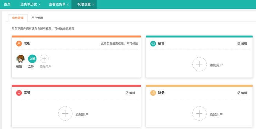系统为您预置了一些常用角色,例如销售、库管、财务等,并对每个角色设置了默认权限,管理员可以统一为这些角色调整权限范围,还可以为角色组添加新的员工;
